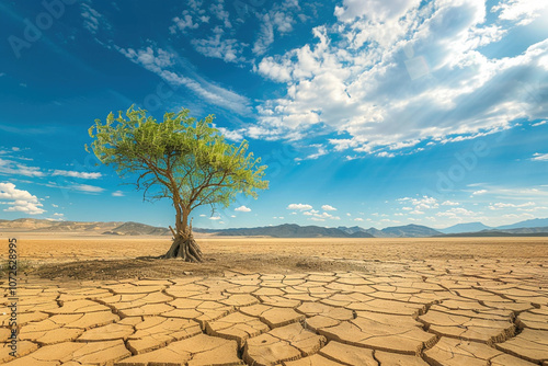 Drought, motivation and desire to live despite everything, persistence and hard work concept. Lone tree thriving in arid cracked desert landscape under blue sky.