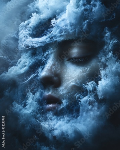 Drowning Silence surreal image of figure submerged dark endless ocean surrounded wave of abstract swirling pattern water thick oppressive mix of deep blue black representing suffocating silence