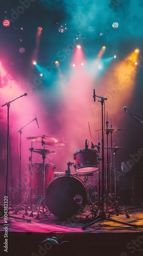 Drum Kit on Stage with Microphones and Lights, AI generated illustration