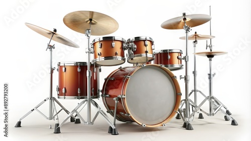 Drum Set with Cymbals on White Background, Music , Instrument, Percussion, Drums