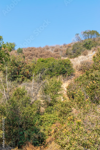 Dry brush, tall trees, and steep hillsides of Southern California mountains on hot summer day