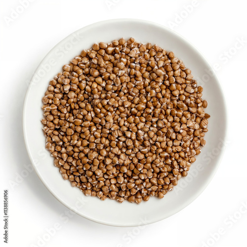 Dry buckwheat groats uncooked in a white plate on an isolated white background, top view