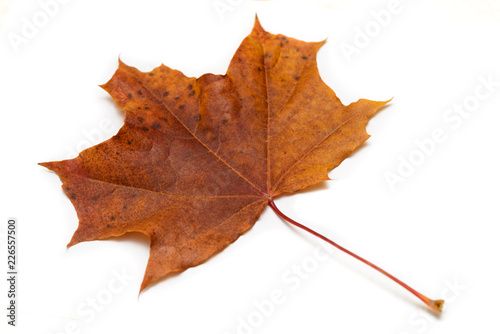 Dry maple leaf on a white background. Side view.