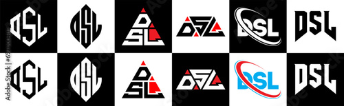 DSL letter logo design in six style. DSL polygon, circle, triangle, hexagon, flat and simple style with black and white color variation letter logo set in one artboard. DSL minimalist and classic logo