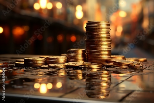 Dual coins and graph in cityscape symbolize financial growth and stock market success Generative AI