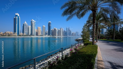 Dubai Canal waterfront promenade, sunny day, skyscrapers in background. Possible use tourism, travel brochure
