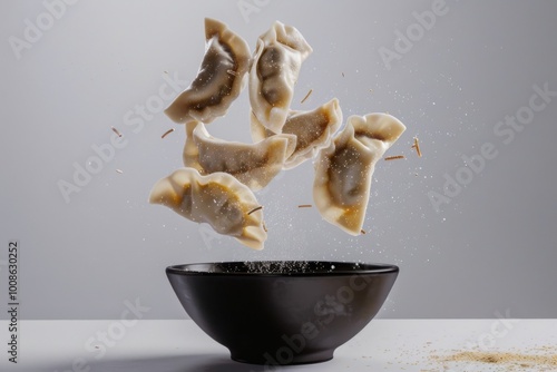 Dumplings floating towards a bowl, capturing the essence of deliciousness and culinary creativity. gyoza.