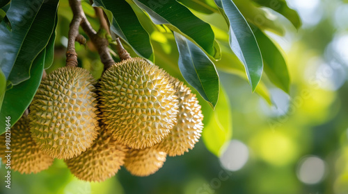 Durian tree with multiple fruits hanging from branches, surrounded by lush green leaves, showcasing unique spiky texture of durians. scene evokes sense of tropical abundance and natural beauty