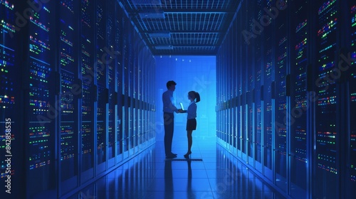 During work in the Tech Facility Data Center, a multi-ethnic female system administrator and a Caucasian male information technology engineer discuss and brainstorm with a laptop