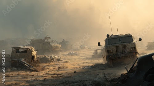 Dusty Evocative Battlefield with Abandoned and Broken Vehicles