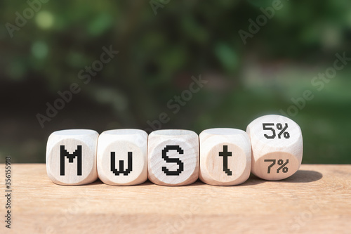 Duty and taxes. German tax cut on value-added tax (VAT). Wooden blocks with one inverted block. VAT reduction from 7% to 5% for consumption in restaurants. Economic crises concept.