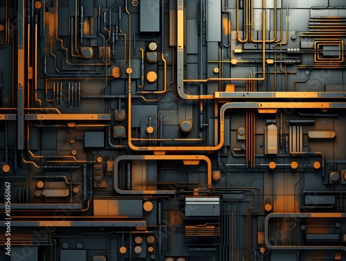 Dynamic 3D industrial background. Modernity and innovation. Intricate geometric shapes and textures. Mechanical elements. Technological advancement. Depth and complexity.