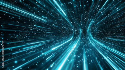 Dynamic abstract background with glowing blue light trails forming a speed tunnel effect, futuristic cyber energy flow. Generative AI