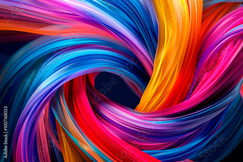 Dynamic abstract composition with swirling, ribbon-like shapes in vibrant colors of blue, red, pink, yellow, and orange, creating a sense of movement and energy