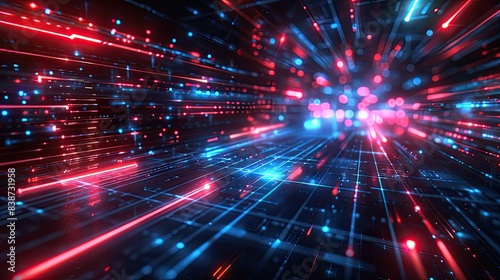 Dynamic abstract image of red and blue light trails representing high-speed data transfer in a digital network..