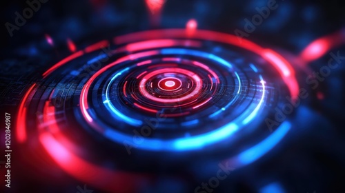 Dynamic action of target bullseye with glowing red and blue neon rings concept in futuristic digital environment