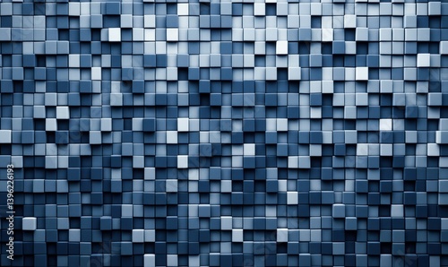 Dynamic arrangement of blue and gray cubes creating an elegant, textured, three-dimensional surface.