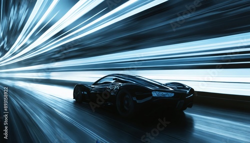 Dynamic automotive motion on high-speed highways, illuminated auto speed in futuristic neon tunnels