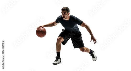Dynamic basketball player dribbling with determined focus on white backdrop