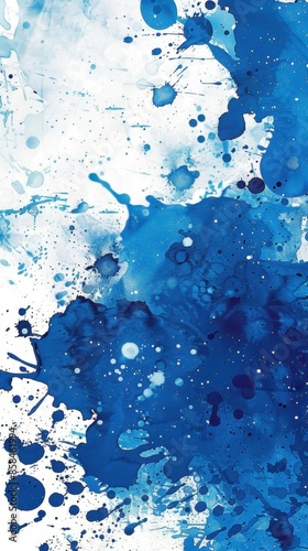 Dynamic blue and white abstract painting with splatters, drips, and various shapes creating a fluid, energetic composition. The interplay of colors adds depth and movement.