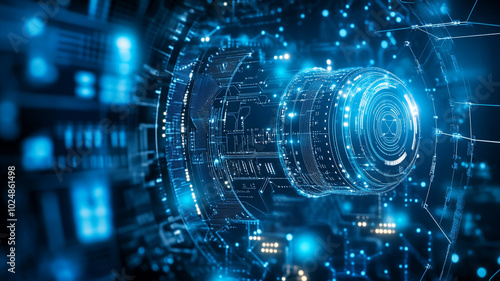 Dynamic blue digital interface showcasing advanced technology and data visualization at night