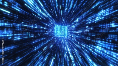 Dynamic blue digital tunnel representing data transmission and technology innovation, illustrating speed and connectivity.