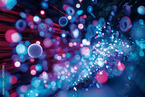 Dynamic bokeh light trails in blue, pink, and purple, creating a sense of motion and a futuristic digital landscape
