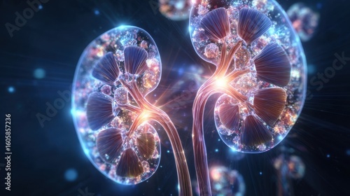 Dynamic CGI showing the movement of bright crystalline kidney stones causing ureter constriction with radiant reflections.