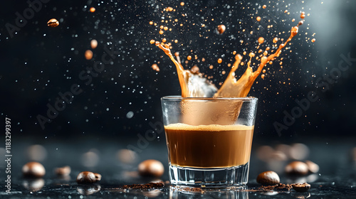 Dynamic coffee bean splash event specialty drink preparation indoor studio artistic close-up