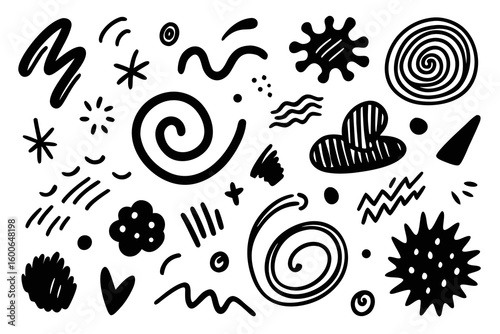 Dynamic collection of abstract black doodles and hand drawn shapes creating a vibrant, modern, and playful artistic composition perfect for creative projects and design elements.