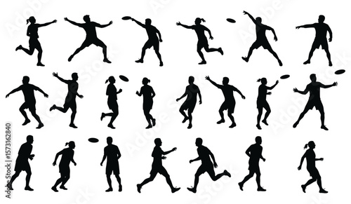 Dynamic Collection of Ultimate Frisbee Player Silhouettes in Various Action Poses – Featuring Male and Female Athletes Throwing, Catching, and Running for Sports and Fitness Designs