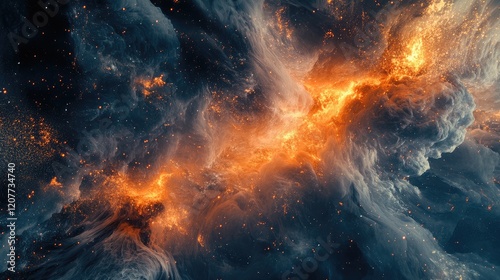 Dynamic cosmic explosion featuring fiery orange sparks amid swirling blue and black clouds in deep space atmosphere.