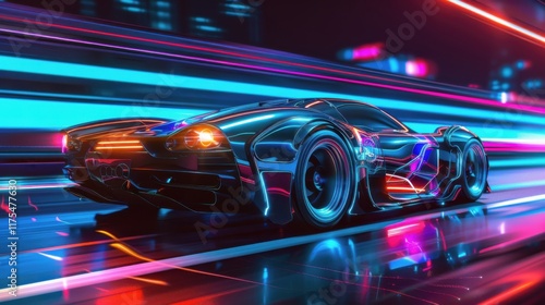 Dynamic cyber modern car in neon lights during daytime racing simulation