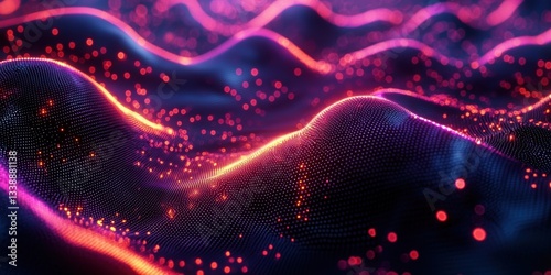 Dynamic dark purple gradient with neon orange and pink dots creates a futuristic abstract design.