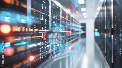 Dynamic data center with vibrant lights and high-speed connections, showcasing modern technology in action.