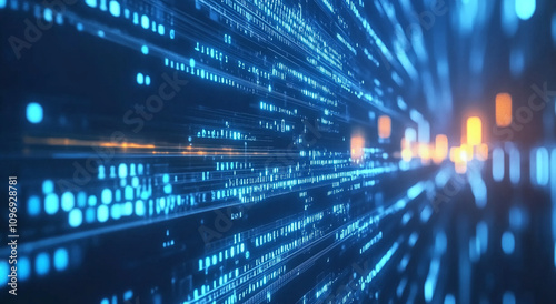 Dynamic digital data streams create an illusion of speed and technology in a blue and orange abstract composition