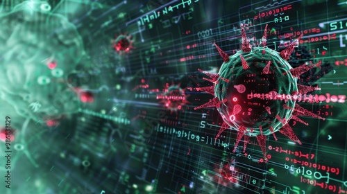 Dynamic Digital Illustration of a Computer Virus Attack Featuring Binary Code, Broken Screens, and Glitch Effects Representing the Spread of Malware Across a Network