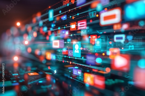 Dynamic Digital Interface with Colorful Icons and Data Streams Representing Modern Technology and Connectivity