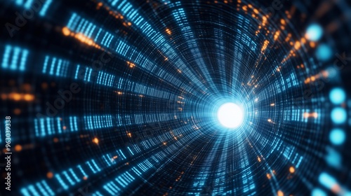 dynamic digital tunnel illuminated by streaks of light and cascading data streams, curving into the distance, representing a journey through cyberspace