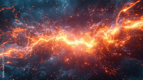 Dynamic Energy Burst with Vibrant Orange and Blue Lightning in a Dramatic Cosmic Sky Background