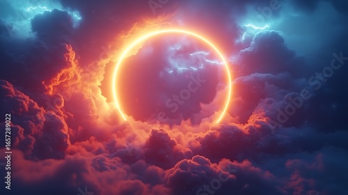 Dynamic ethereal scene: large glowing orange ring at center, background with colorful clouds (fiery orange and red on lower right, cool blue and purple on upper left), white and light blue lightning i