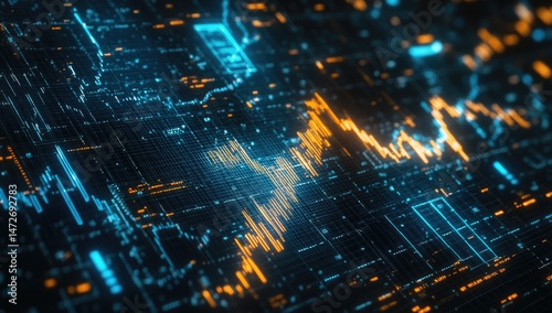 Dynamic financial data visualization on a digital display. Complex network of glowing lines and charts