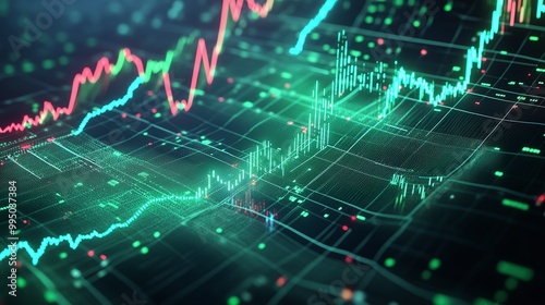 Dynamic financial data visualization with colorful graphs and charts representing market trends and analytics.