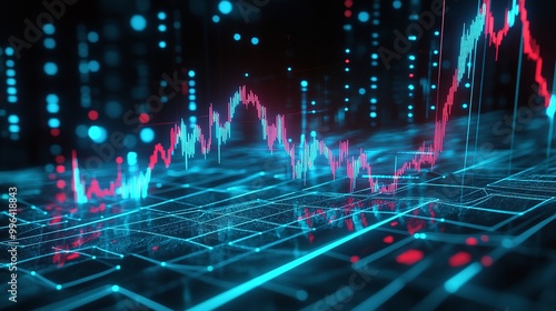 Dynamic financial data visualization with colorful graphs and digital elements on a dark background.