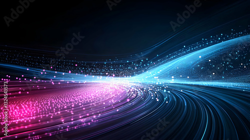 Dynamic Flow of Pink and Blue Particles in Digital Cyberspace on a Dark Background