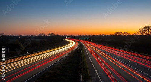 Dynamic highway streaks at sunset warm light trails blur motion. AI Generated