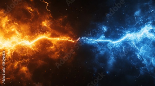 Dynamic hot orange and cold blue electrical lightning strikes creating a powerful energy burst in a dark stormy atmosphere