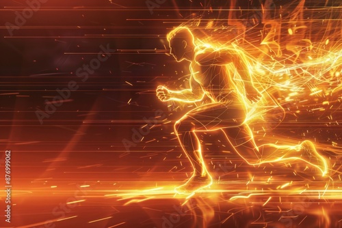 Dynamic illustration of a glowing runner with fiery trails, set against a futuristic backdrop. Ideal for fitness