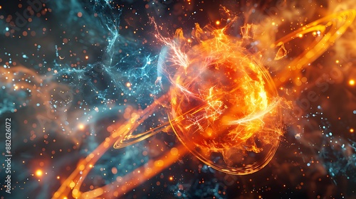 Dynamic illustration of atoms crashing together, emitting sparks and energy waves