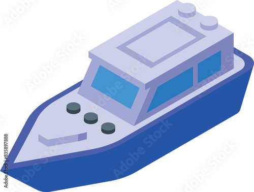 Dynamic isometric blue speedboat illustration with modern design and luxury features, suitable for marine transportation and leisure activities on the water, isolated on a white background